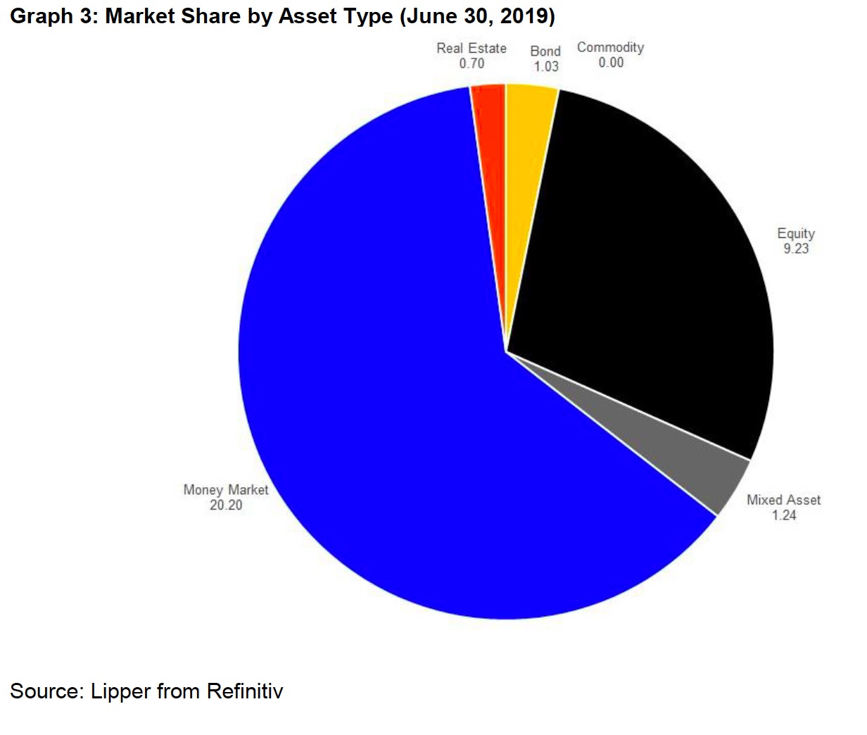 كانت صناديق سوق النقد (20.2 مليار دولار)، وهي أحد أنواع الأصول التي تضم أعلى الأصول المدارة في نهاية يونيو 2019، تليها صناديق الأسهم (9.2 مليار دولار)، وصناديق الأصول المختلطة (1.2 مليار دولار)، وصناديق السندات (1 مليار دولار) ، والصناديق العقارية (0.7 مليار دولار)، وصناديق السلع الأساسية (2 مليون دولار).
